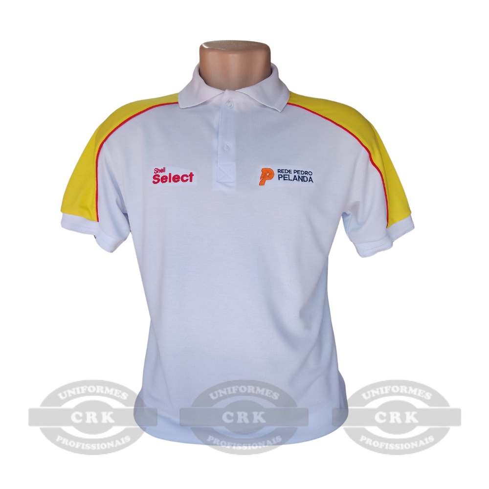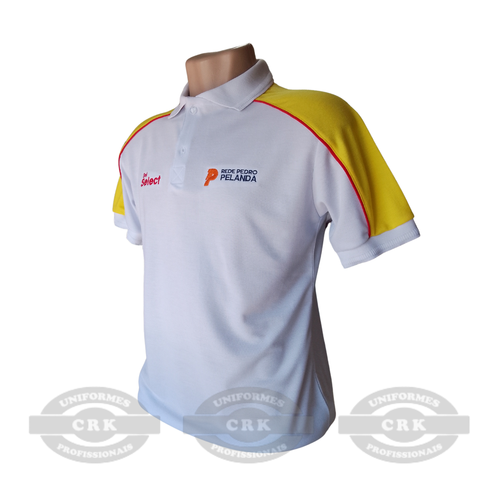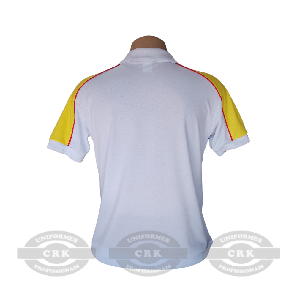 Estilo leve e marcante: A camisa tem como base a cor branca, com mangas amarelas e filete vermelho que percorre os ombros e laterais superiores, criando um contraste visual moderno e cheio de personalidade. Está disponível em outras combinações de cores, conforme a identidade do cliente e a disponibilidade da fábrica.