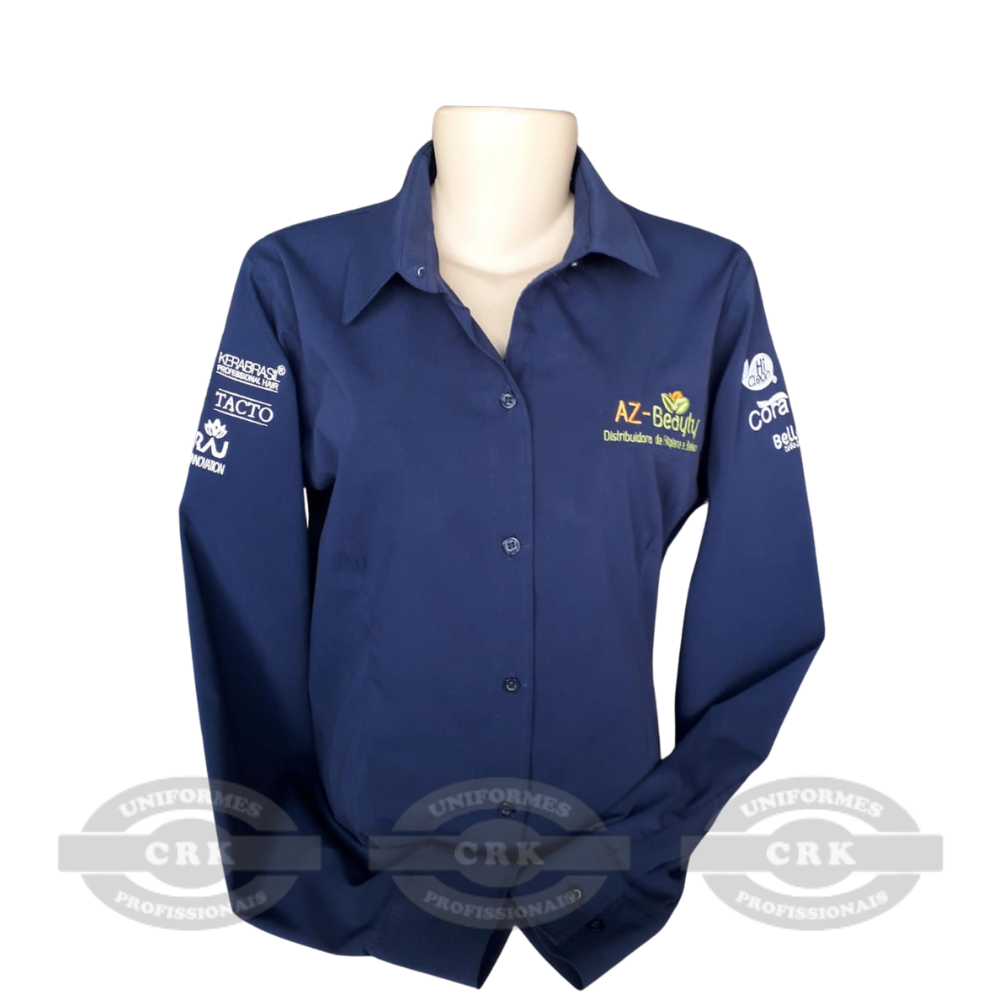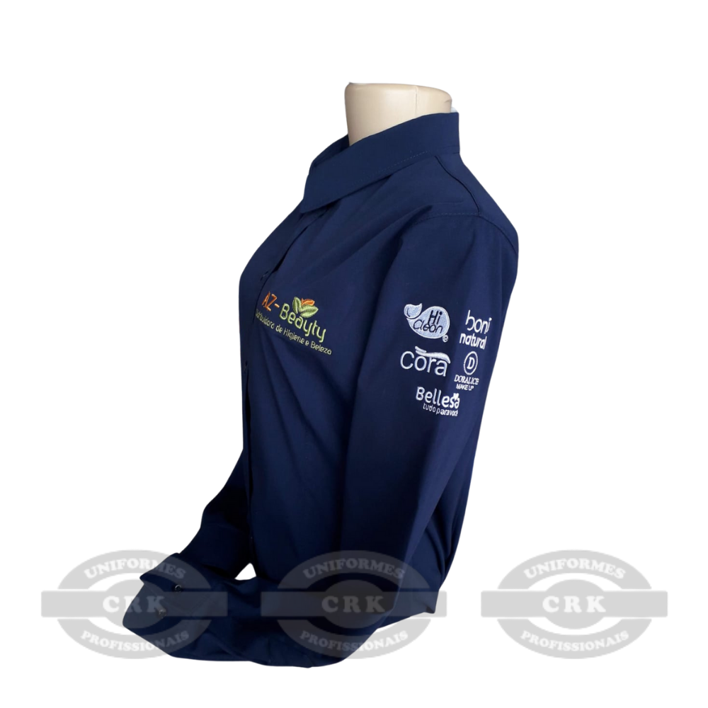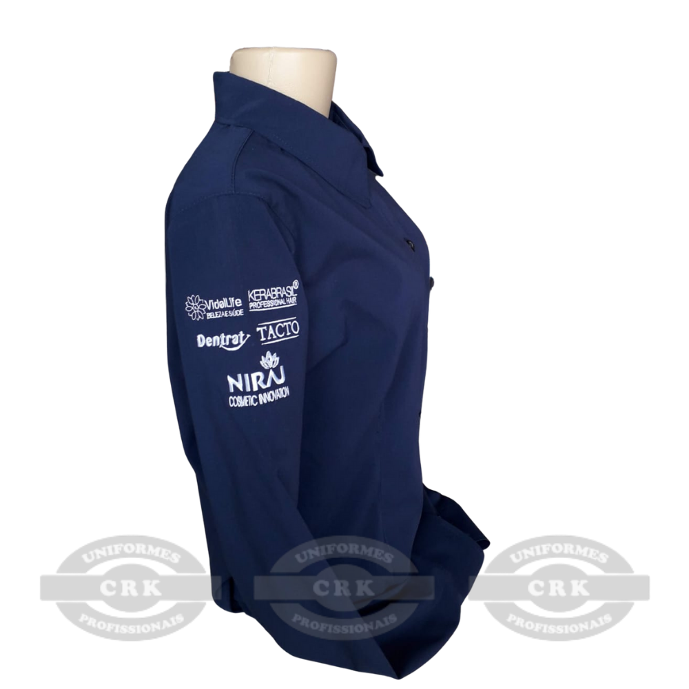 Essa camisa social azul marinho é uma excelente escolha para quem busca um uniforme corporativo elegante, com múltiplas personalizações. Os bordados distribuídos entre peito e mangas destacam os parceiros, projetos e identidade da equipe, sem abrir mão de conforto e sofisticação. Uma peça que transmite profissionalismo e padronização com alto impacto visual.