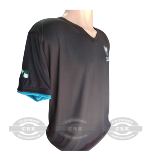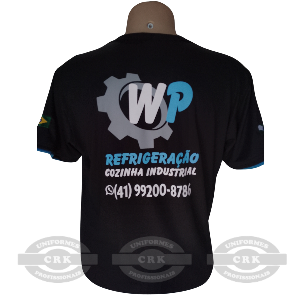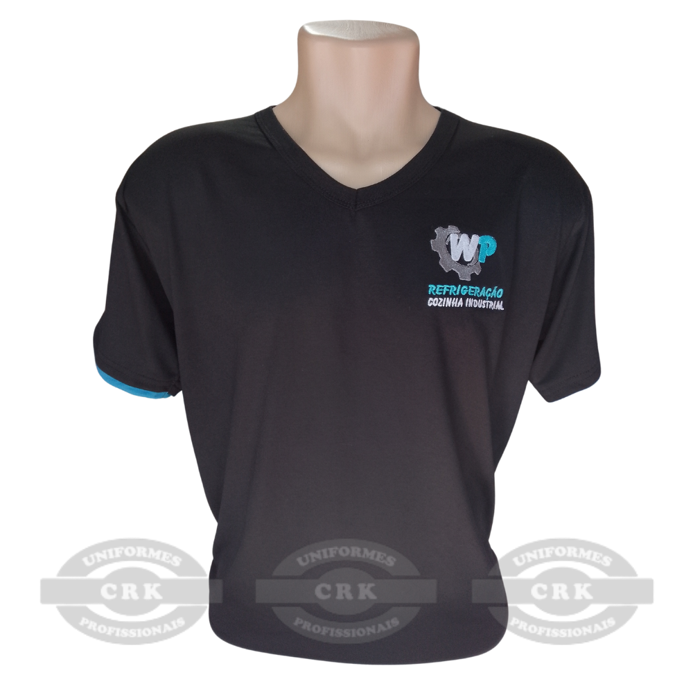 Visual corporativo com forte identidade de marca: A base preta transmite sobriedade e profissionalismo, enquanto os detalhes em azul nas mangas e as estampas bem posicionadas garantem destaque e valorização da identidade visual da empresa.