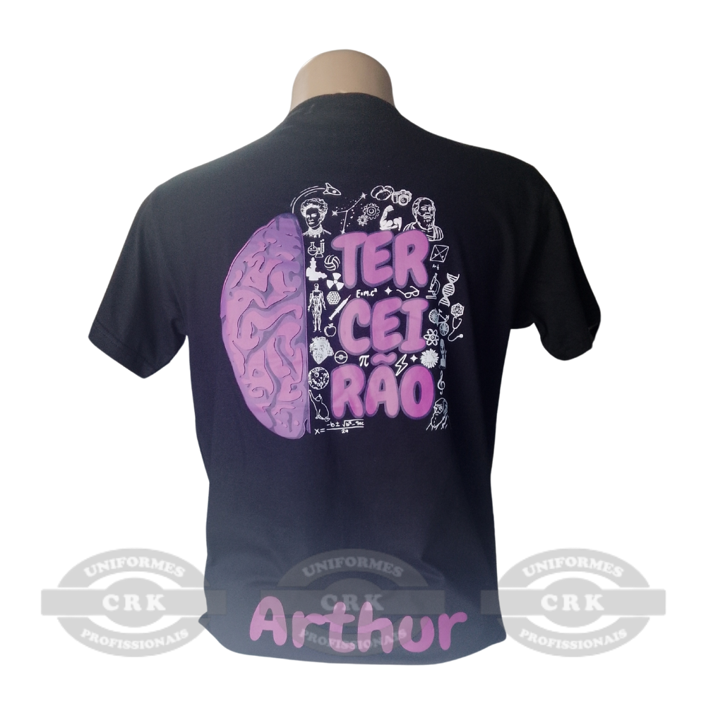 Estampa personalizada e temática: A frente traz arte compacta e moderna com tipografia ousada, enquanto as costas apresentam uma ilustração conceitual acompanhada do nome da turma e personalização com o nome do aluno — tudo com impressão de alta definição. Os elementos gráficos podem ser adaptados conforme o projeto de cada grupo.