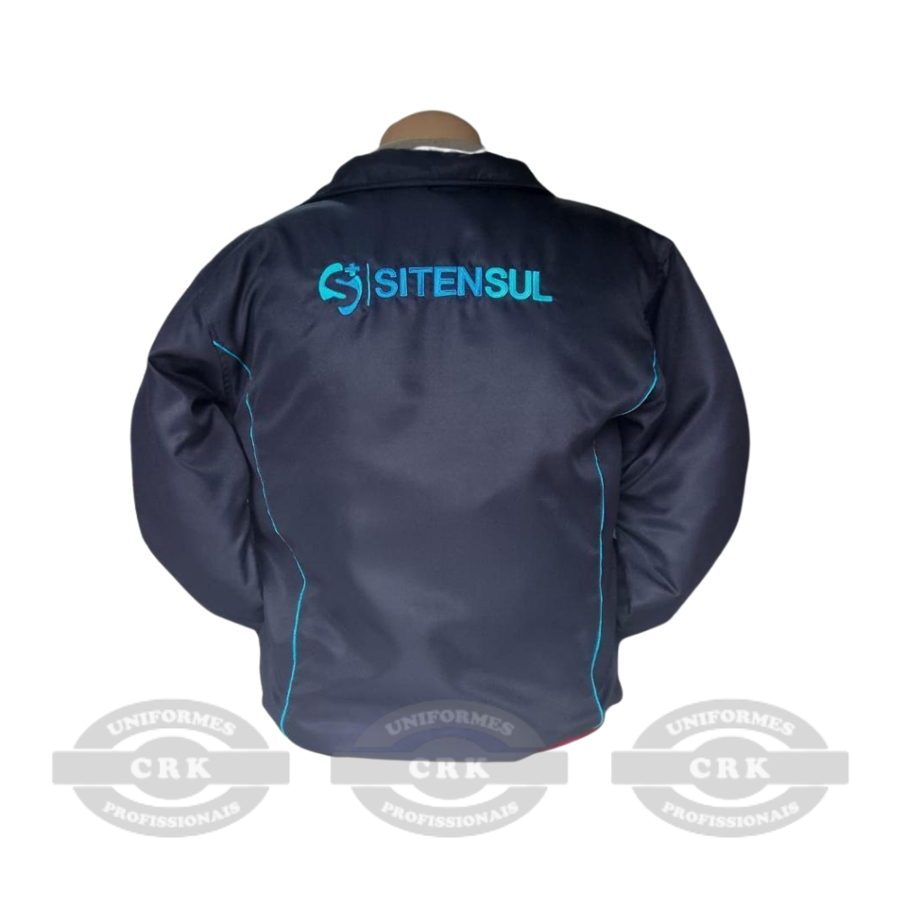 Personalização em destaque: Logo Sitensul bordado na frente e nas costas, promovendo visibilidade e padronização da equipe.
