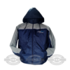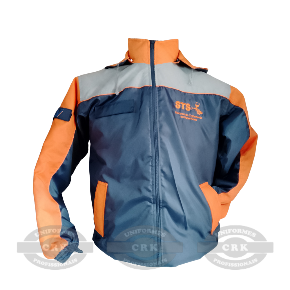 Modelo com zíper frontal, gola alta e capuz embutido: Oferece proteção completa contra vento e chuva, sendo ideal para uso em ambientes externos ou sob intempéries.