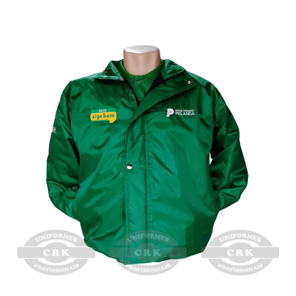 Modelo com zíper frontal e gola alta com botão de pressão: Desenvolvido para oferecer proteção eficaz contra vento e umidade, mantendo os colaboradores aquecidos e secos em ambientes externos.