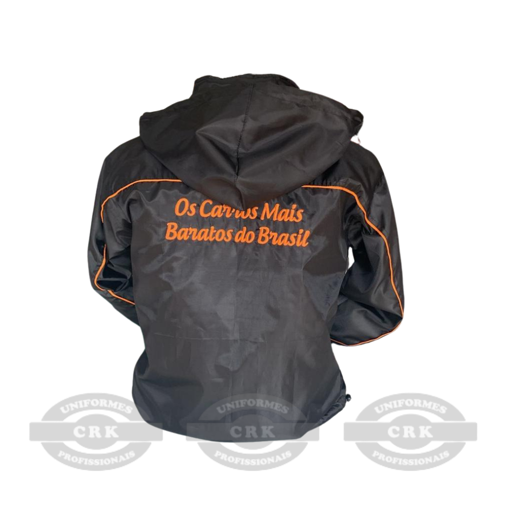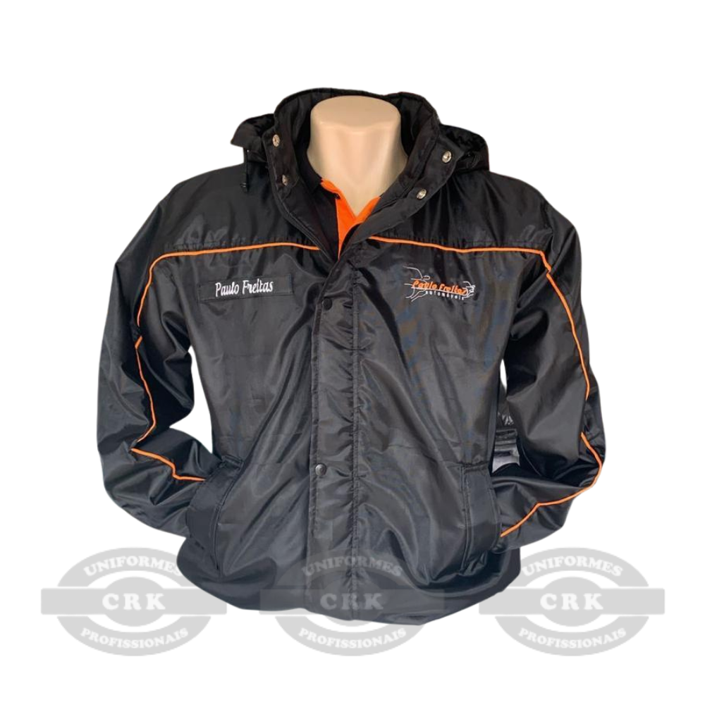 A jaqueta preta com detalhes em laranja e capuz é uma peça estratégica para empresas que desejam unir conforto, proteção e visibilidade de marca. Com design moderno, bordado personalizado com nome do colaborador e slogan nas costas, ela transforma a equipe em um verdadeiro cartão de visitas. O tecido leve e resistente é ideal para rotinas dinâmicas e climas variados. Com capuz embutido e bolsos práticos, essa jaqueta é muito mais do que uniforme – é identidade corporativa com funcionalidade.